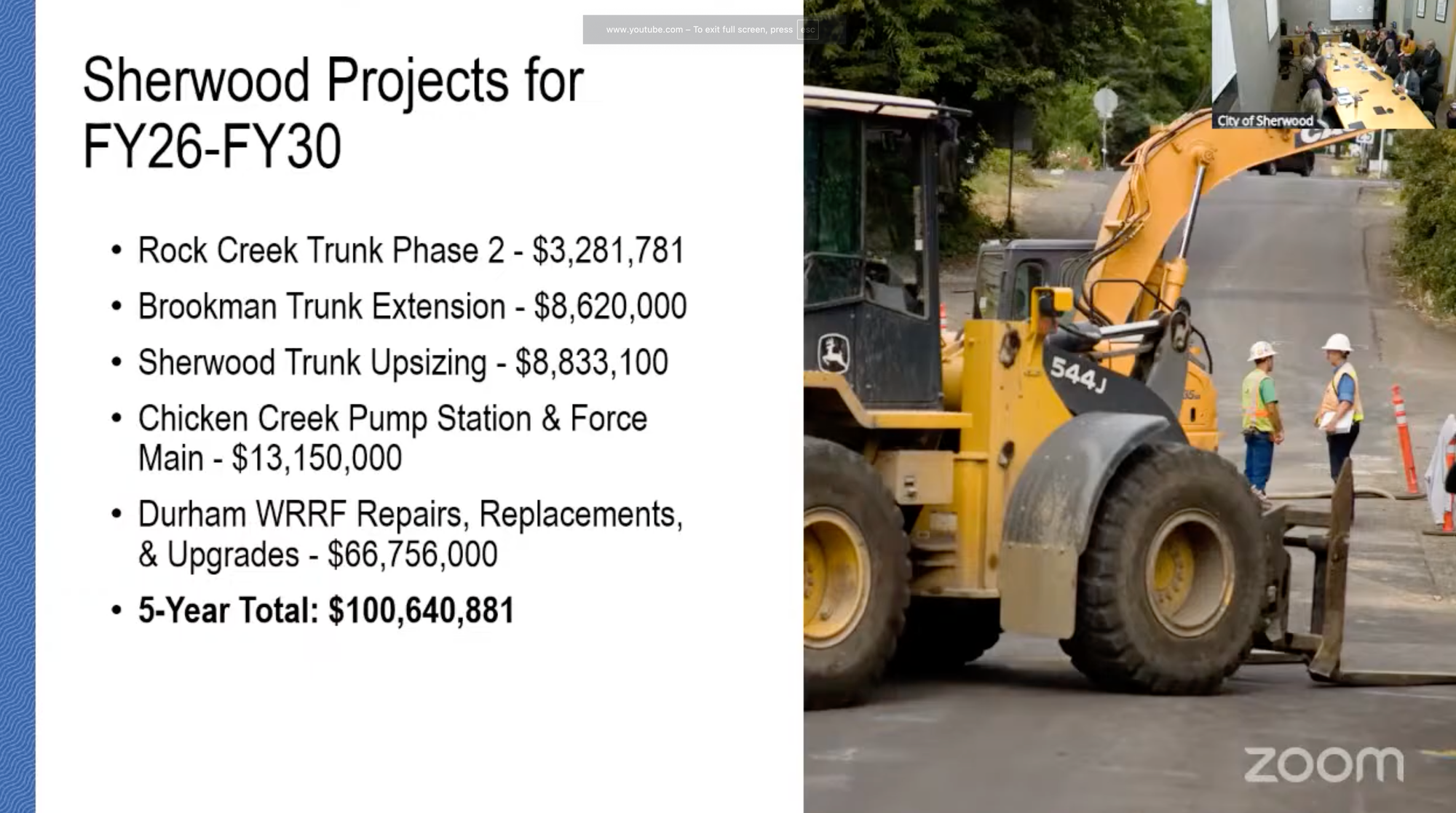 In Sherwood and nearby, there are five projects in the water services plan for fiscal years 2026-2030, totaling $100.6 million. These projects include Rock Creek Trunk Phase 2; Brookman Trunk Extension; Sherwood Trunk upsizing; Chicken Creek Pump Station; and repairs, replacements, and upgrades to the Durham Water Resource Recovery Facility.