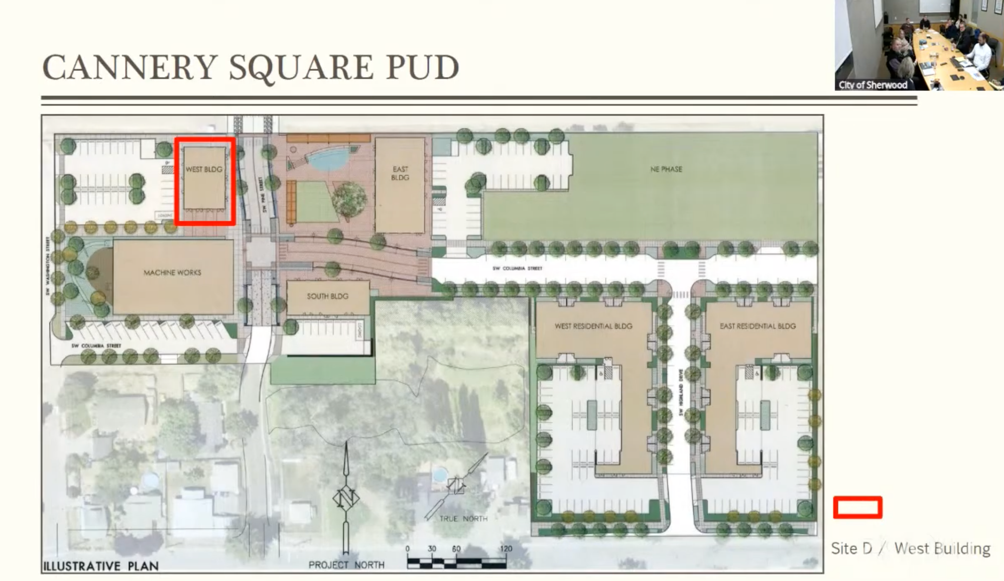 Cannery Square was also discussed in the work session. The residential development phase is completed, but the plan includes a single-story retail building on the vacant gravel lot next to the Sherwood Arts Center.